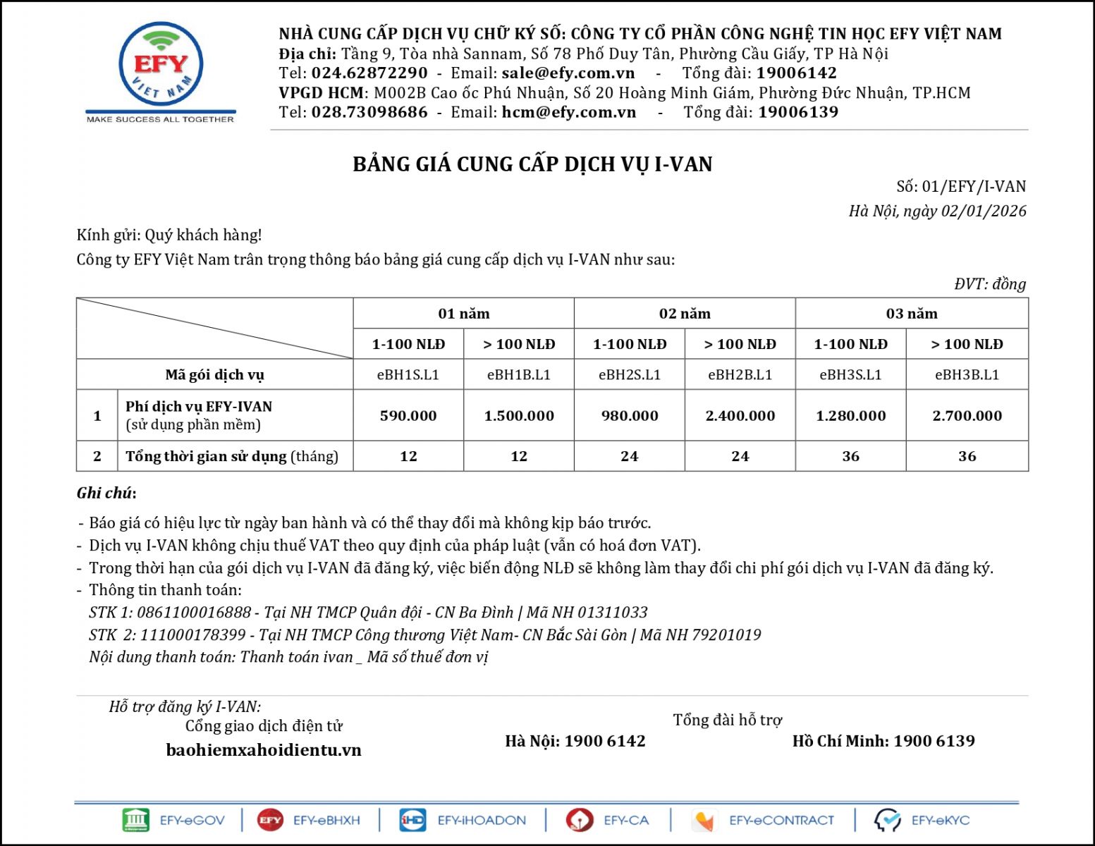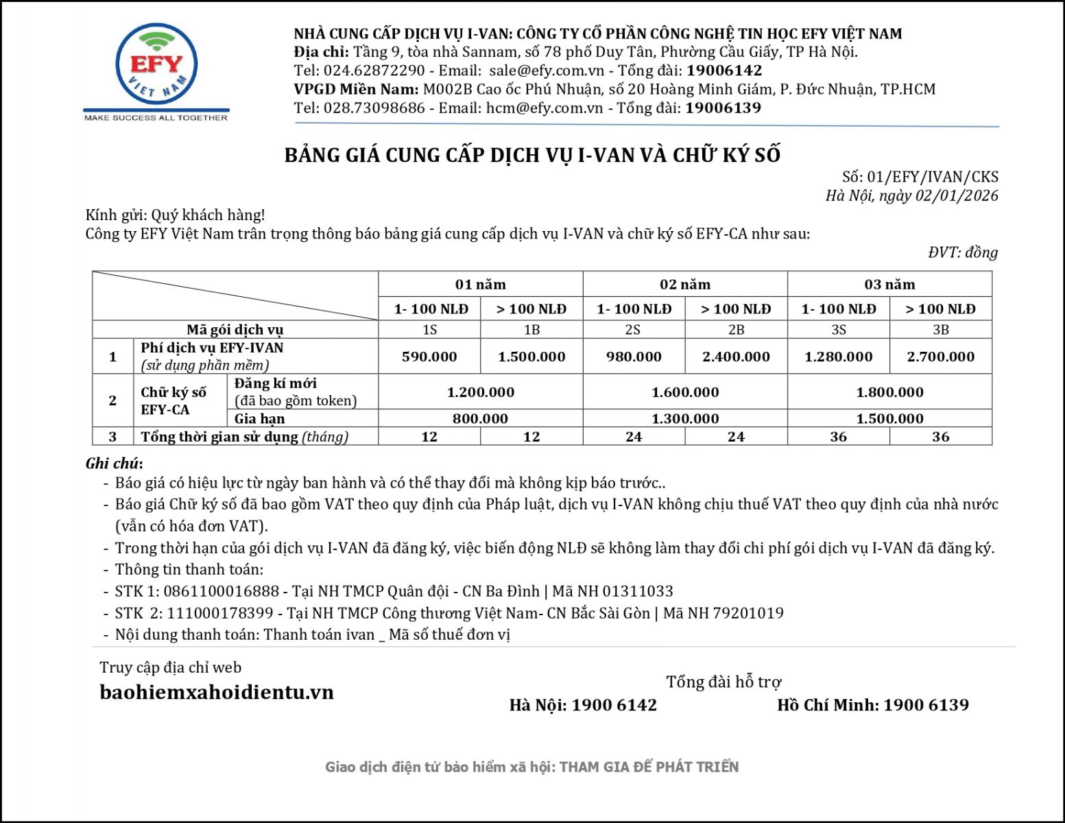 EFY Việt Nam xin gửi tới khách hàng bảng báo giá dịch vụ phần mềm bảo hiểm xã hội điện tử eBHXH. Chúng tôi hoạt động với phương châm "Sức mạnh của sự tử tế" Rất mong được đồng hành trên mọi chặng đường phát triển của quý khách.