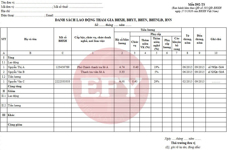 Danh sách lao động tham gia BHXH, BHYT, BHTN, BHTNLĐ, BNN (Mẫu D02-TS)