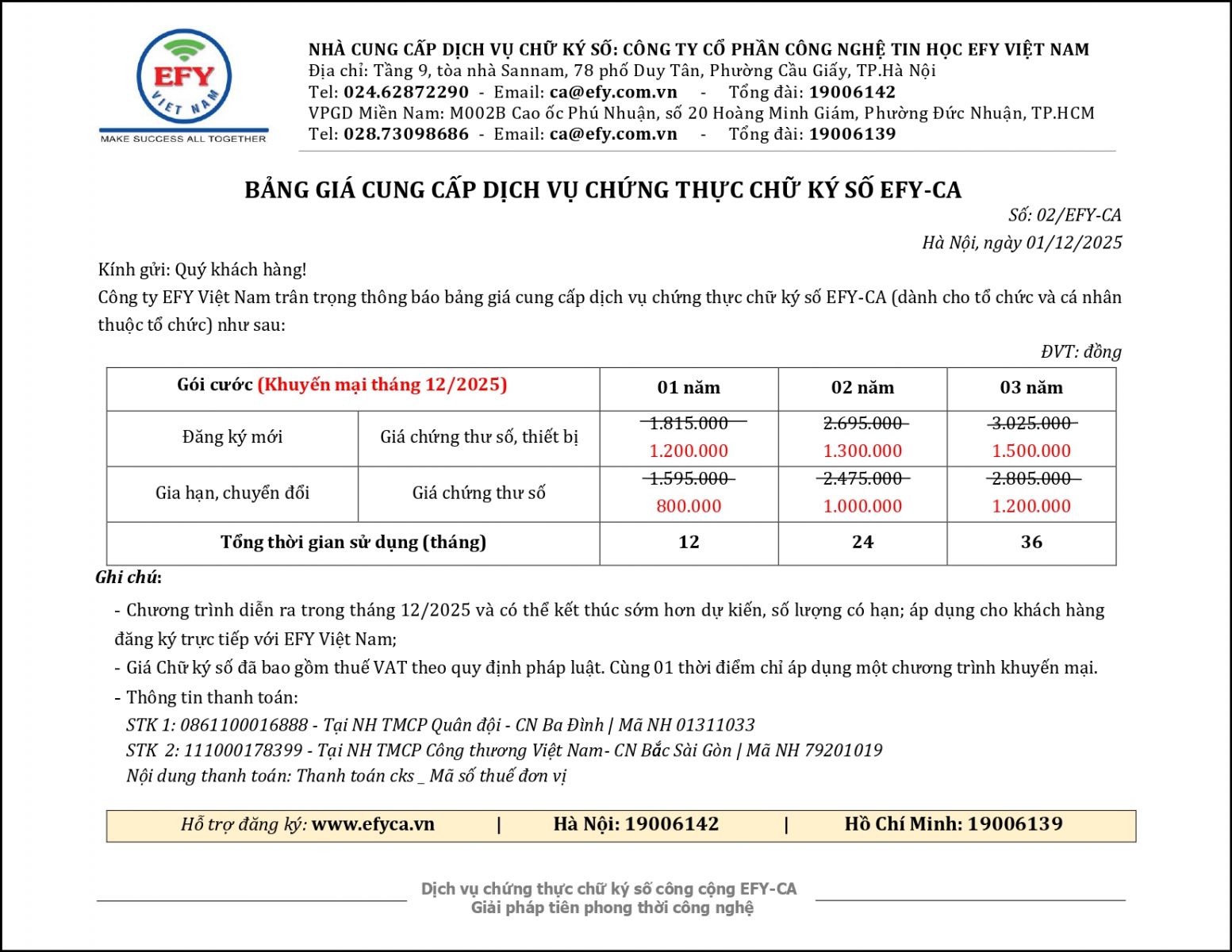 Nhằm đồng hành cùng doanh nghiệp trong mùa cao điểm, giảm bớt áp lực chi phí và tạo điều kiện thuận lợi cho các đơn vị hoàn thành nghĩa vụ pháp lý, EFY Việt Nam triển khai Chương trình khuyến mại chữ ký số tháng 12 với ưu đãi đặc biệt, giảm hơn 50% khi đăng ký mới, gia hạn, chuyển đổi chữ ký số EFY-CA. Cụ thể: