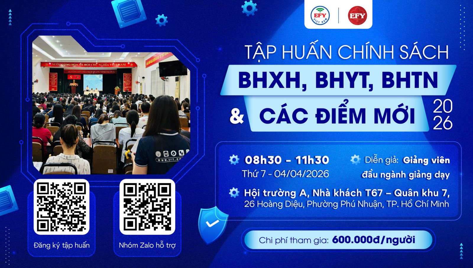 Với mong muốn đồng hành cùng doanh nghiệp, cơ quan hay cá nhân tổ chức làm chủ hoàn toàn nghiệp vụ, EFY Việt Nam chính thức tổ chức khóa tập huấn chuyên sâu tại TP. Hồ Chí Minh với chủ đề: "Tập huấn chính sách BHXH, BHYT, BHTN và điểm mới áp dụng năm 2026 TP. Hồ Chí Minh"