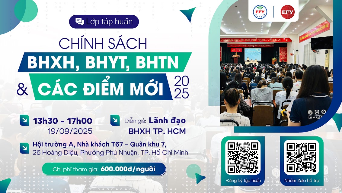 Từ đó, EFY Việt Nam tiếp tục tổ chức lớp tập huấn chuyên sâu về các quy định BHXH, BHYT, BHTN và những điểm mới trong năm 2025 để có thể giúp cho các Quý công ty và NLĐ cập nhật kịp thời những thay đổi mới nhất.