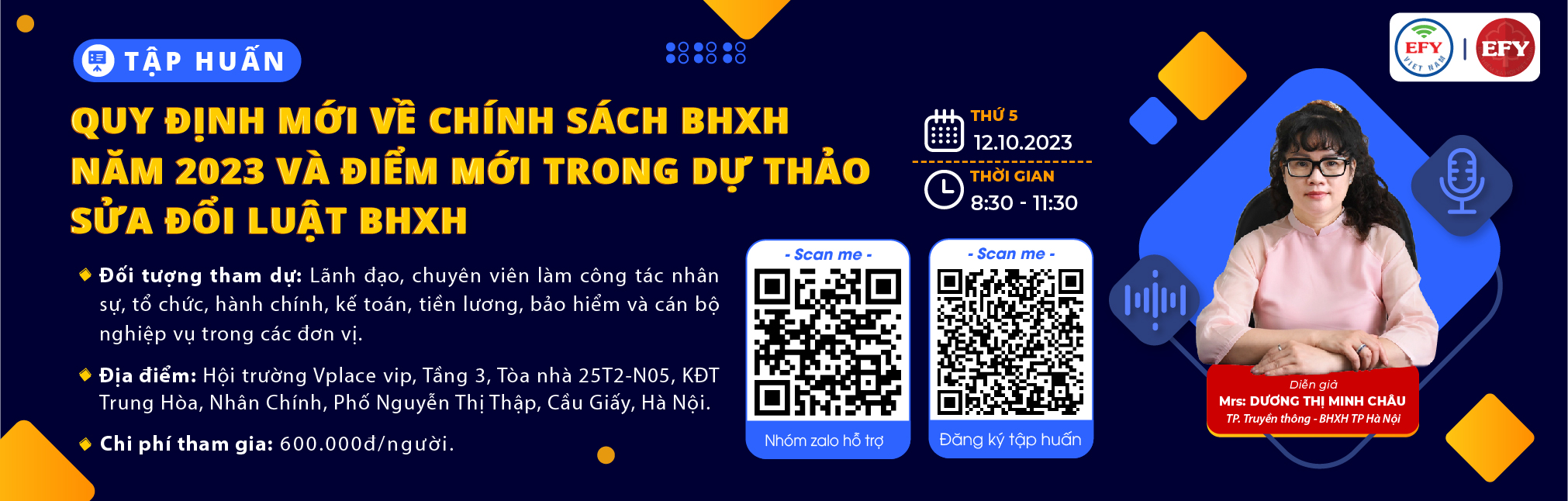 Sáng ngày 12/10/2023, EFY Việt Nam phối hợp với BHXH TP Hà Nội đã tổ chức lớp tập huấn: “Chính sách BHXH năm 2023 và điểm mới trong dự thảo sửa đổi luật”.